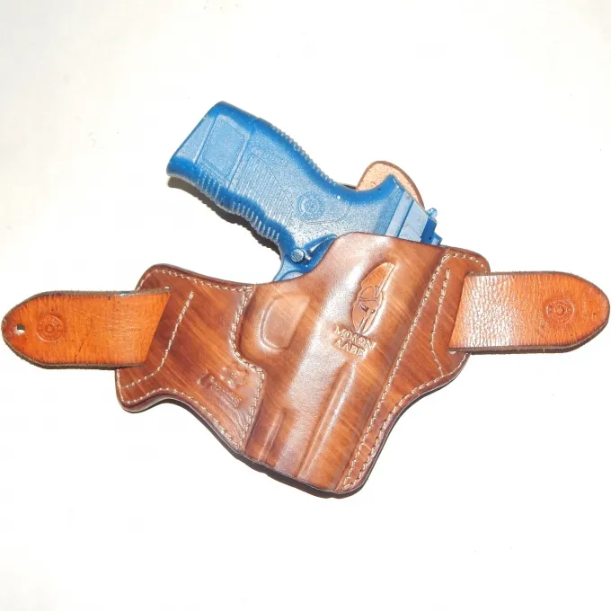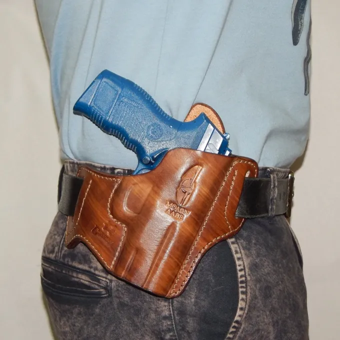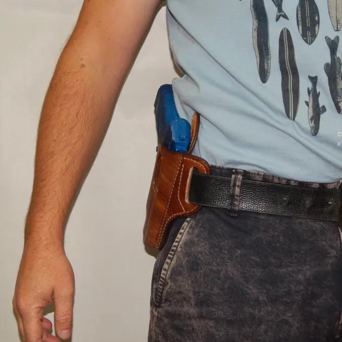Coldre feito sob medida, com 2 placas de couro coladas e costuras para encaixe sob medida e retenção natural das armas a que se destina.