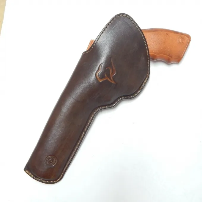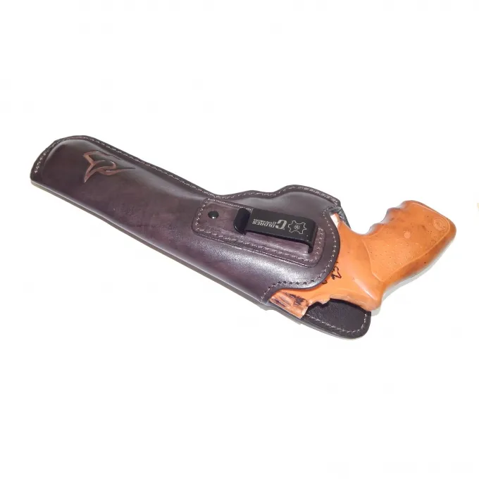 Coldre de Couro Natural, feito artesanalmente com forro de pelica natural, clip de aço exclusivo para uso velado de revólveres Taurus calibre 38 e 357 de 6 tiros, cano de 6 polegadas.